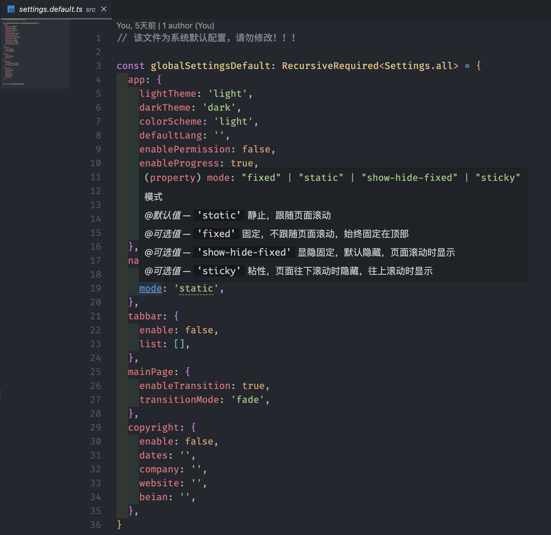 请在 /src/settings.ts 文件中进行配置,而 /src/settings.default.ts 为框架的默认配置,请勿在该文件内修改。