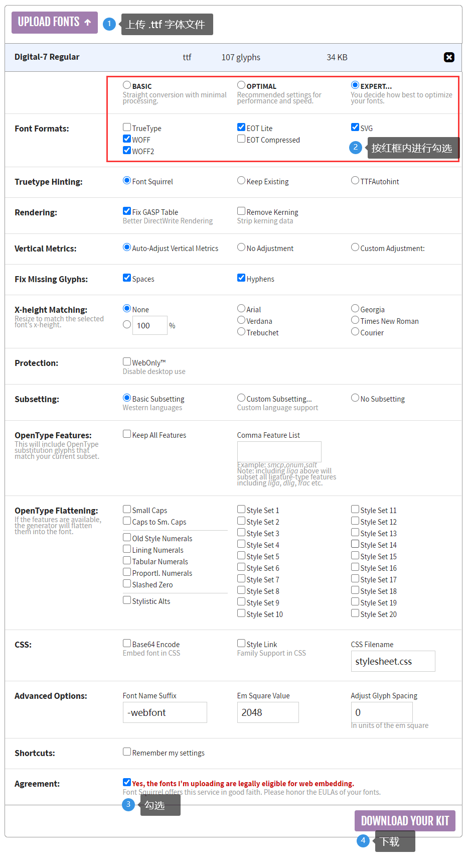 访问 Font Squirrel,上传 .ttf 文件,并按照下面设置后,点击下载。